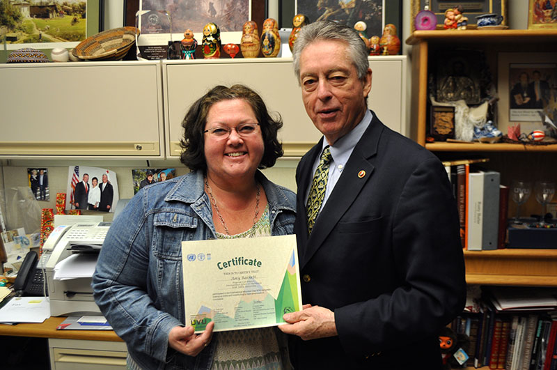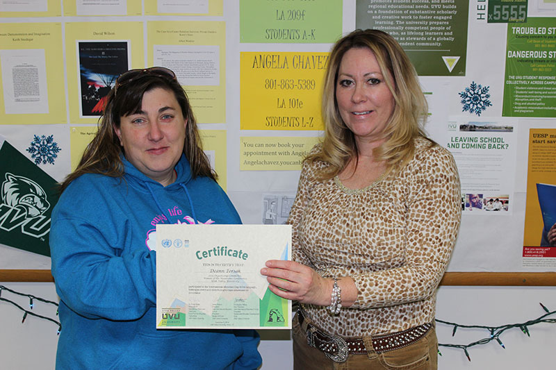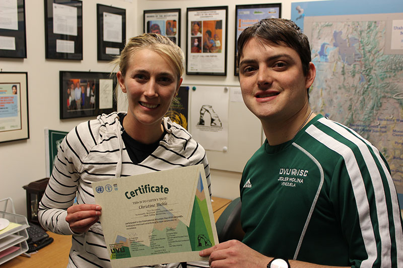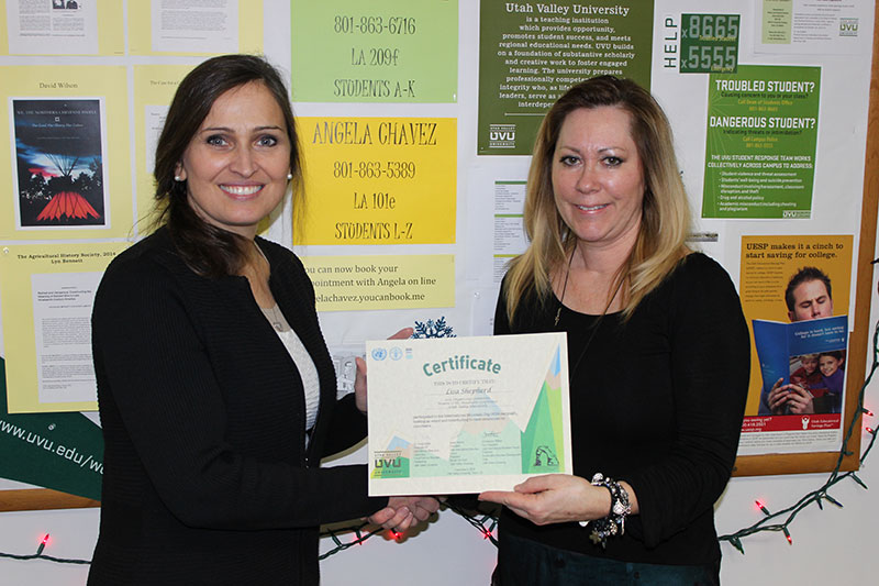 ![]() Presenting Certificate for Contribution to IMD2014 to Amy Barnett, Office of International Affairs and Diplomacy, UVU ( L ); |