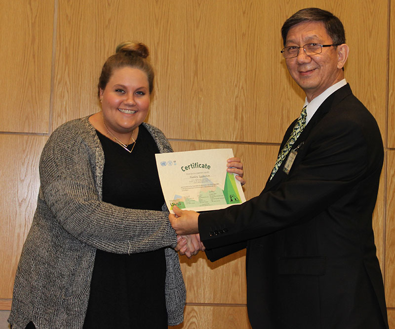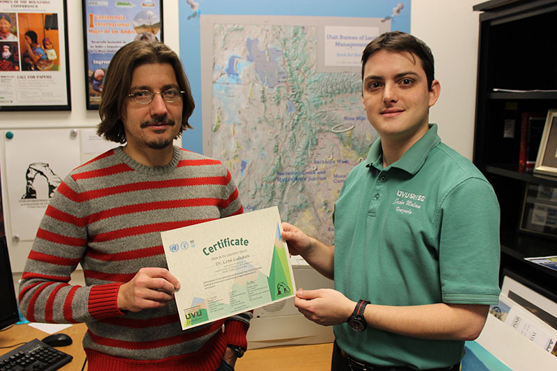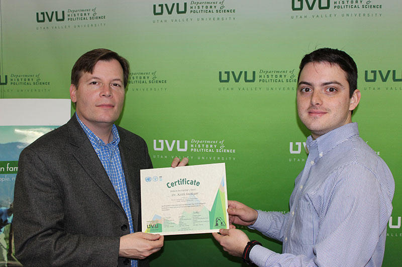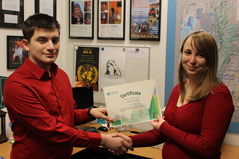 ![]() Presenting Certificate for Contribution to IMD2014 to Dane Ross, Vice President, Sustainable Mountain Development Club, UVU; |