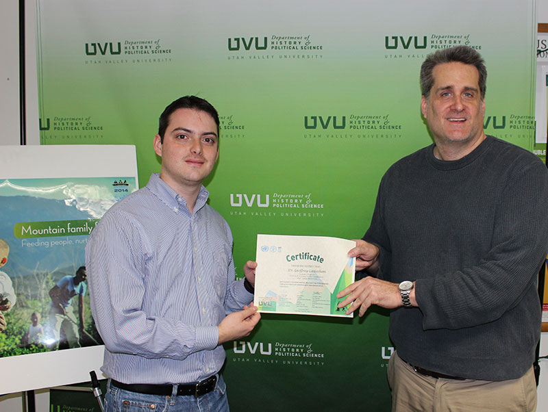 ![]() Presenting Certificate for Contribution to IMD2014 to Dr. Geoff Cockerham, History & Political Science, UVU (R); |