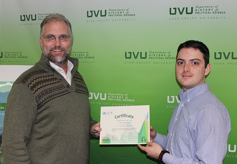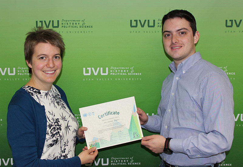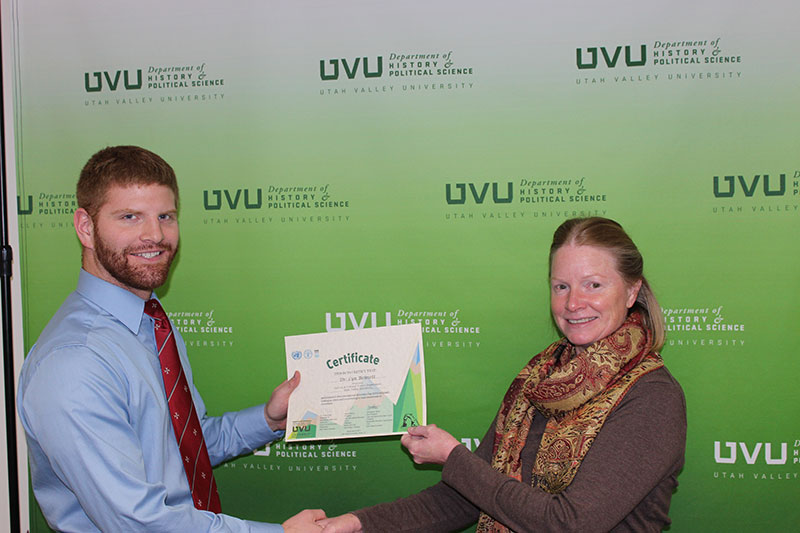 ![]() Presenting Certificate for Contribution to IMD2014 to Deann Torsak, Political Science Student, UVU ( L ); |