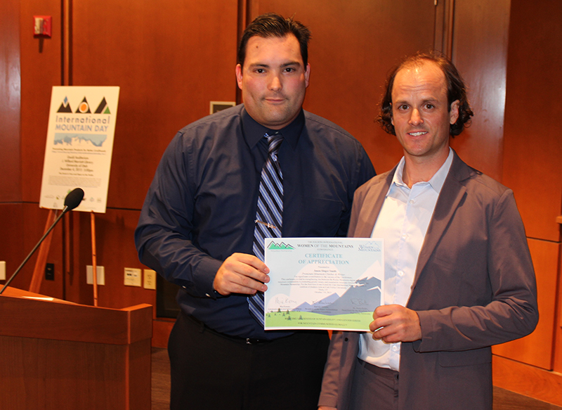![]() Tony Medina, President of the UIMF, presents Jason Singer Smith with a Certificate of Appreciation for his participation in the 2015 Women of the Mountains Conference. |